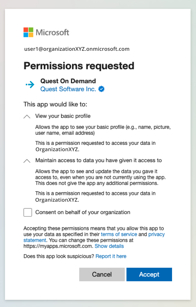 As part of the login process with Microsoft Entra ID, users must consent to the set of minimal permissions required by the Quest On Demand application. By default, all users are allowed to consent to applications for permissions that do not require administrator consent. This behavior might be disabled in some Microsoft Entra tenants and may require tenant administrators to enable user consent flow for the Quest On Demand application.