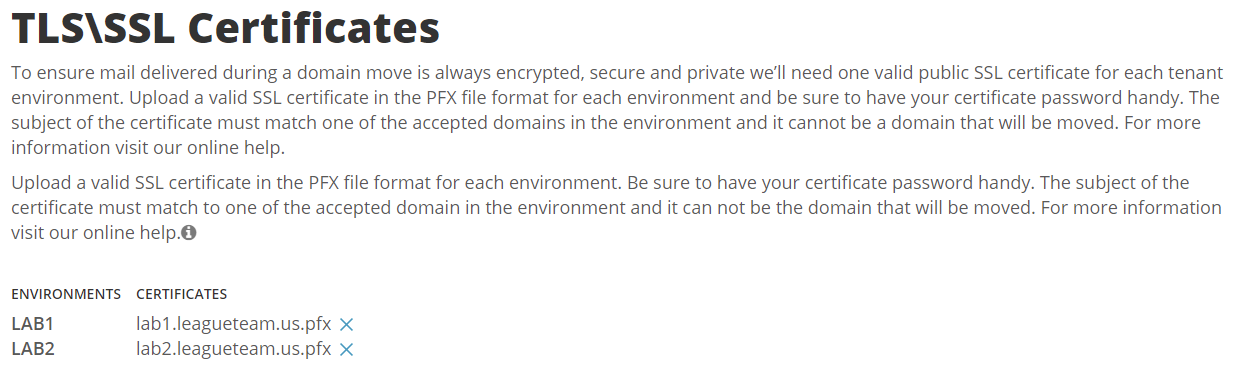 14. Upload a SSL Certificate for each environment.  On Demand Migration for Active Directory will ensure mail delivered during a domain move is always encrypted, secure and private by using this SSL Certificate.  Click Nextonce the certificates are uploaded.