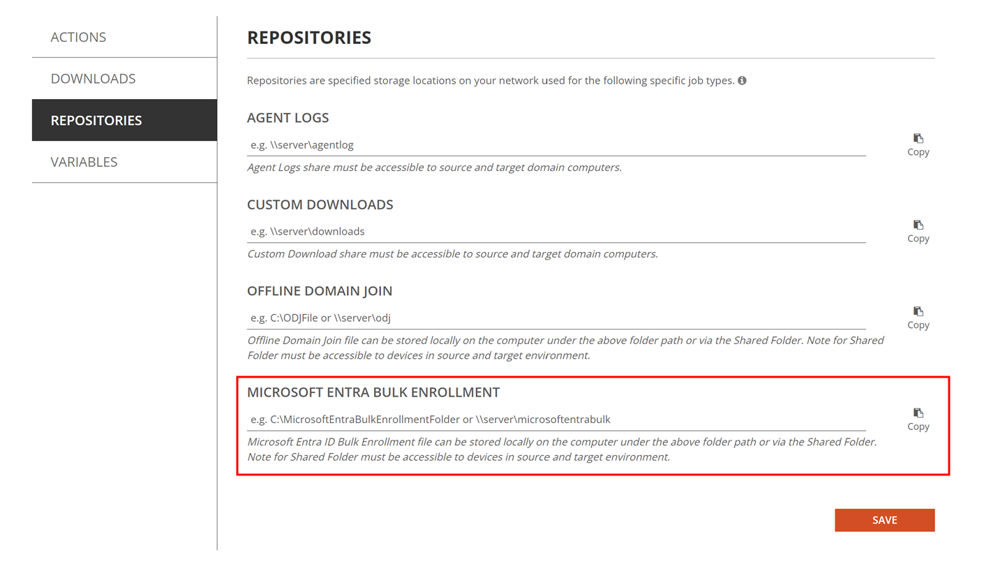 4. Click Repositories and specify the Provisioning Package Local Path or Shared Folder’s UNC Path under Microsoft Entra Bulk Enrollment.  Click Save.
