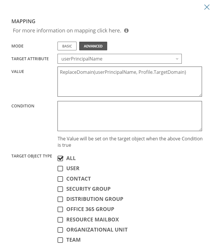 In addition to basic mappings, you can perform advanced mappings for target attributes using values and conditions within a template’s Mapping settings. Advanced mappings provide the flexibility needed to meet complex scenarios.