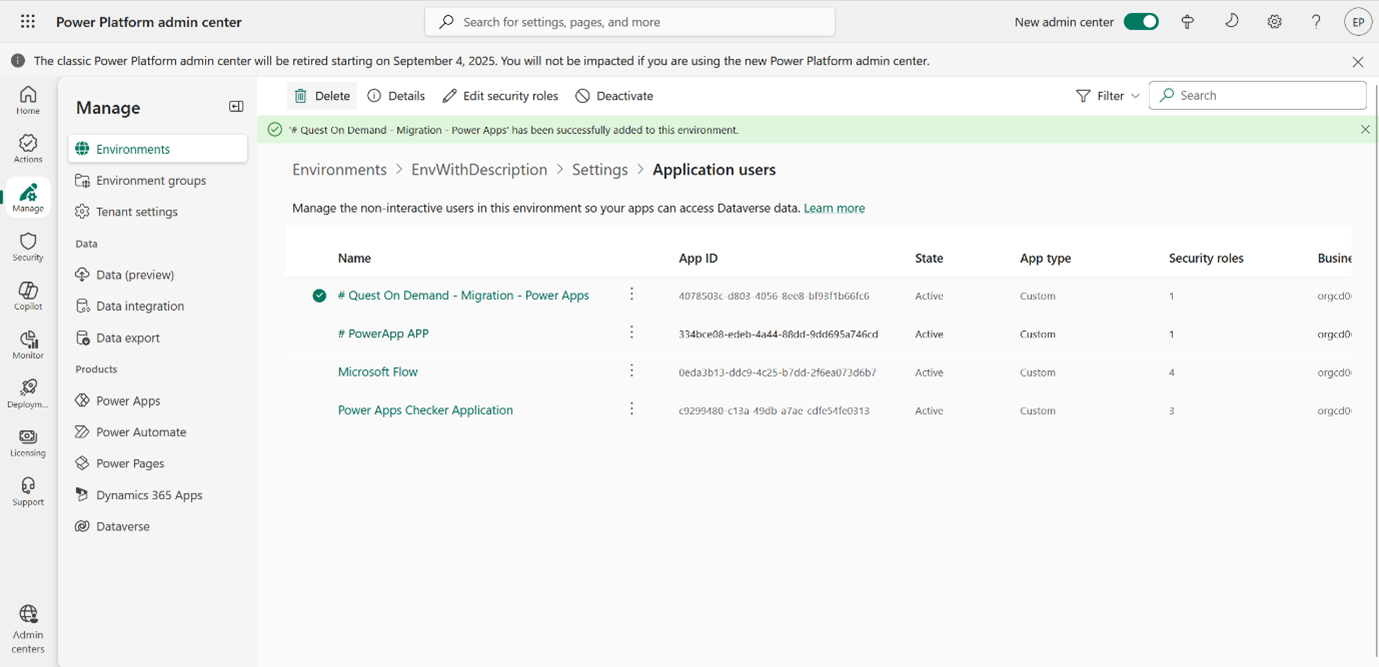 - On the the Settings > Application Users page, verify that the ODM service principal (the new app user) has been successfully added for the selected environment.