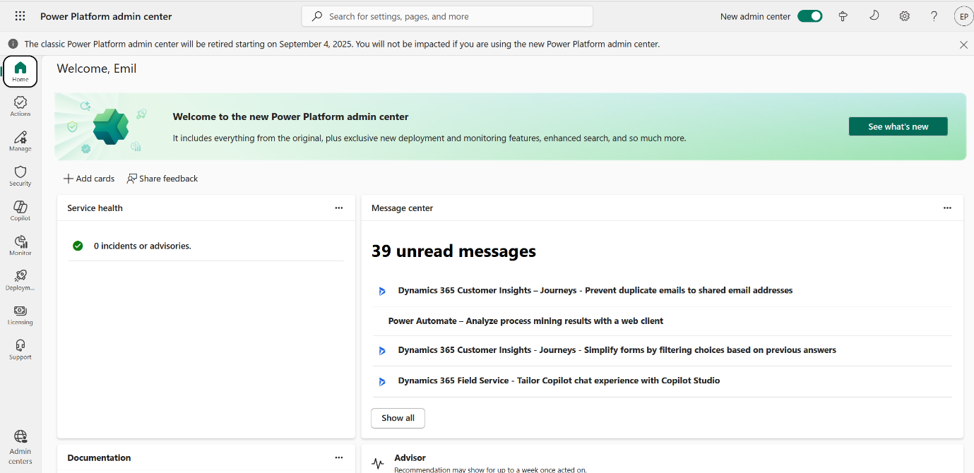 - Login into Power Platform admin center https://admin.powerplatform.microsoft.com as the tenant Administrator.