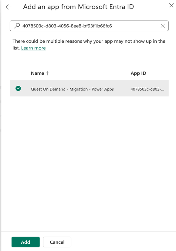 - Click Add an app. Search for the Quest service principal using ID : 4078503c-d803-4056-8ee8-bf93f1b66fc6 which is the same id that you used to create the application. Click Add to save the service principal Quest On Demand - Migration - Power Apps.