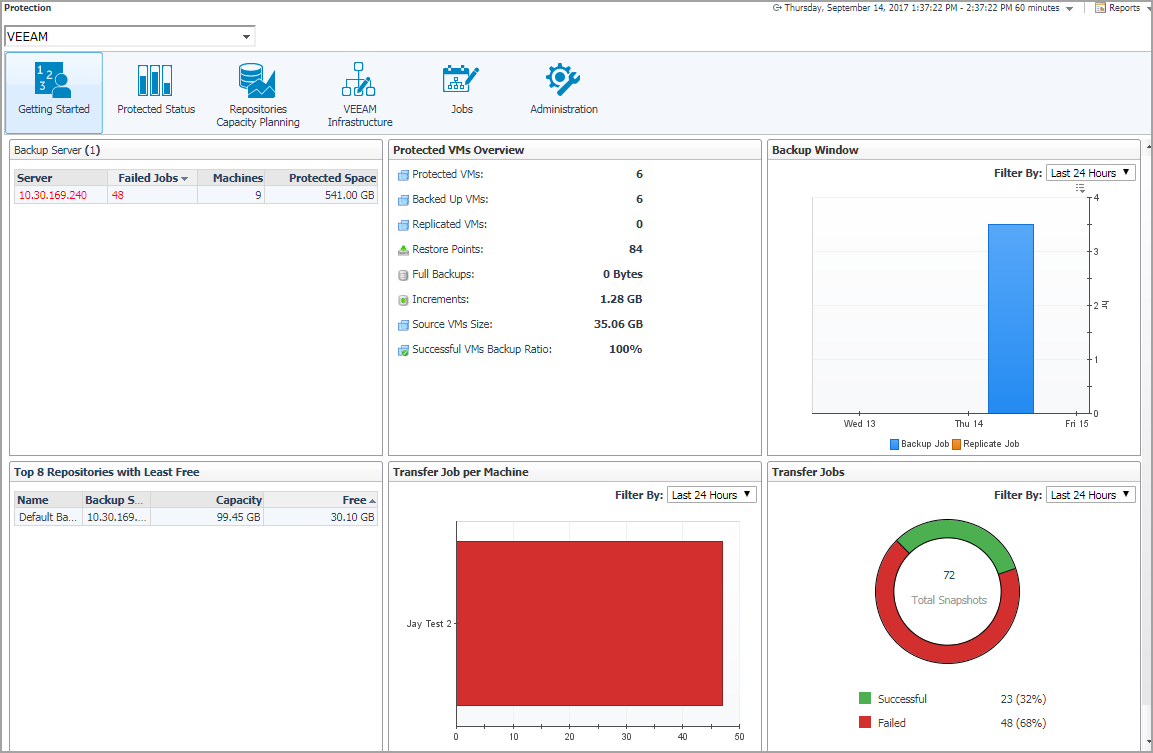 The Getting Started view of the Protection dashboard shows the data collected in the Veeam Servers.