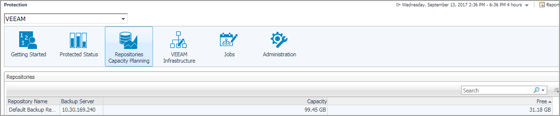 The Repositories Capacity Planning view of the Protection dashboard shows the information about repositories in which backup snapshot data captured from your monitored protection environment is stored and managed. The Repositories Capacity Planning view includes the following two elements: