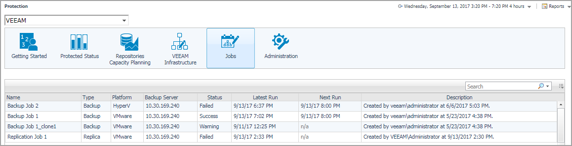 The Jobs view of the Protection dashboard shows backup jobs for the Backup Servers, a specific protected or replicated machine in the monitored Veeam environment.