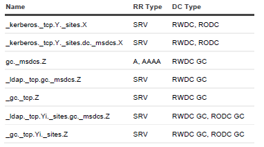 • For DNS servers that have not been restored, its RRs associated with the DNS server are removed. This is performed during the Configure DNS server step. The following RRs are removed where Z is the forest FQDN, X is the domain default NC FQDN, Y is the site name.