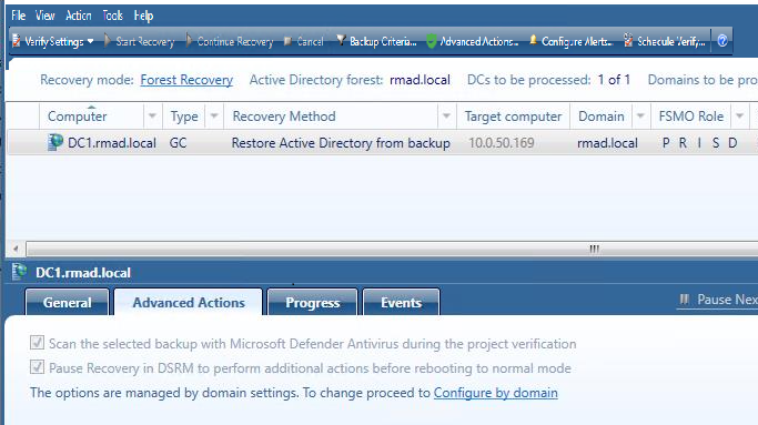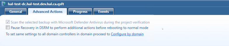Pause recovery in DSRM to perform additional actions before booting to normal mode can be enabled for specific domain controllers by selecting the option from the Advanced Action tab from each domain controller in the project, or for all domain controllers in the entire domain/forest.