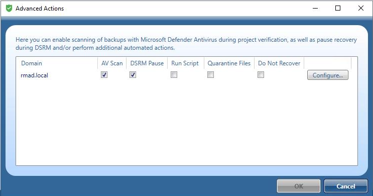 You can use this tab to make choices for scanning of malware or server maintenance during recovery. RMAD does not scan and remediate with this feature. The feature pauses the recovery during Directory Services Restore mode (DSRM) before the domain controller is restarted into normal mode allowing users to perform maintenance and run their own scans using third party tools and/or remediate if malware found.