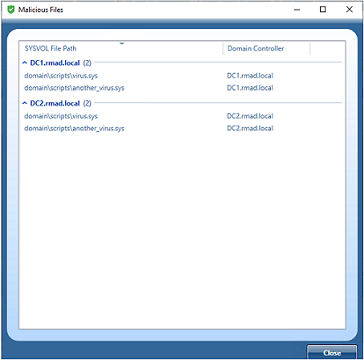 Malicious files are shown for each backup selected for a domain controller, and the list can be grouped and/or sorted by SYSVOL File Path and Domain Controller. A list of the files is also included in the Forest Recovery Report, click View | Report….