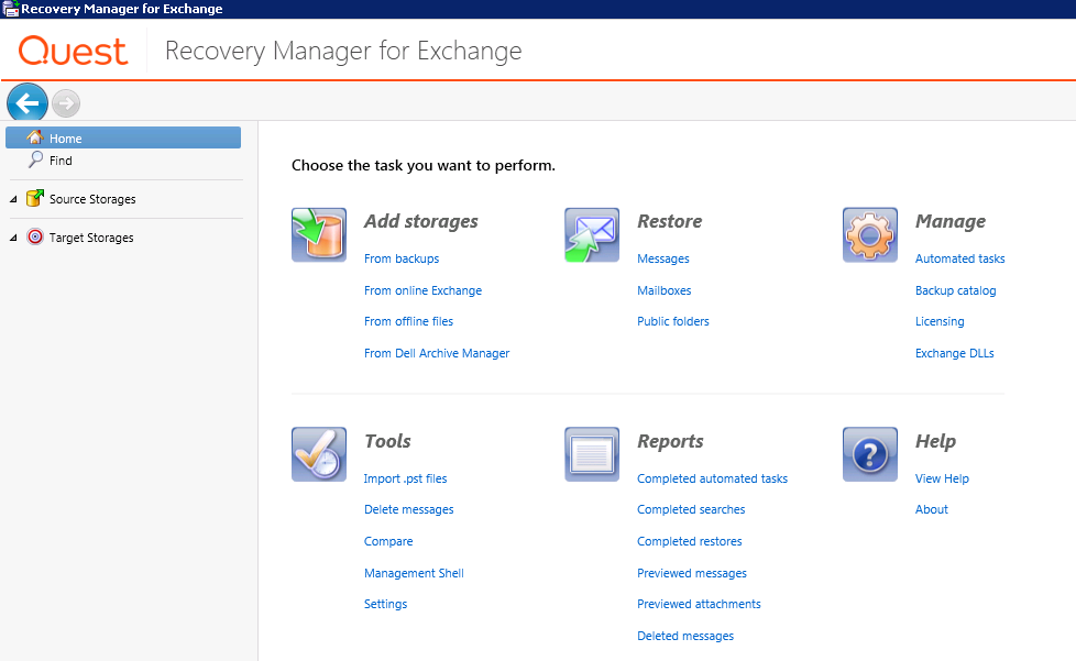 • Delete messages. Click this link to start a wizard that helps you find and selectively delete messages from writable source storages registered with Recovery Manager for Exchange. For more information, see Message Delete Wizard.