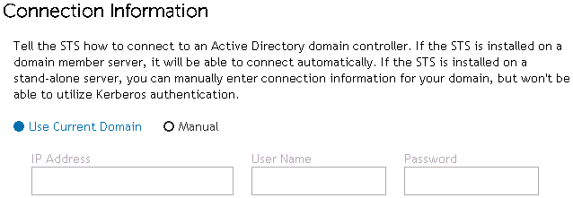 Select this option to connect using the domain member server where the Security Analytics Engine is installed. This option is intended to be used when you install the Security Analytics Engine on a member server of your corporate Active Directory domain in which you want to authenticate users. The Security Analytics Engine Windows® service uses the credentials of the service account (LocalSystem or an account specified during installation) to connect to Active Directory. | |||||||||
