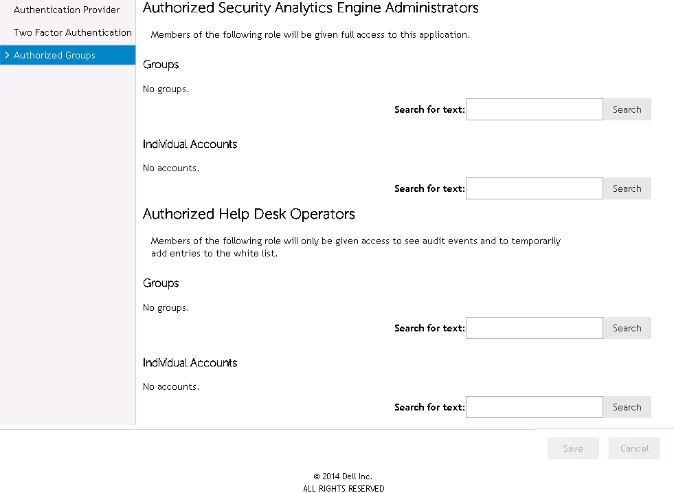 This dialog appears when the Search button is clicked in the Group section of the Authorized Security Analytics Engine Administrators section.
