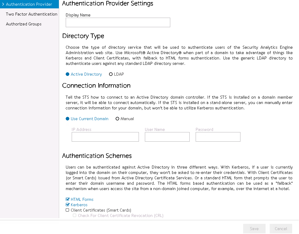 In the Display Name field, enter a name for the authentication provider. This is a display name that is only used within the Administration web pages. | |||||||||