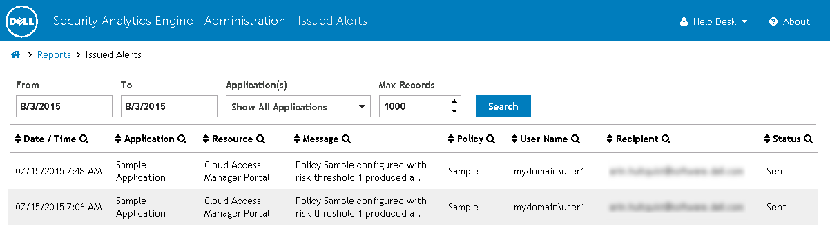 From the Home page of the Security Analytics Engine Administration web site, click on the Reports link to open the Reports page. From the Reports page, click on the Issued Alerts link to open the Issued Alerts page where you can view information on the alerts sent by the Security Analytics Engine. If multiple, identical alerts for the same risk policy occurred within a 5 minute period, the Security Analytics Engine will only display (and send) a single alert.