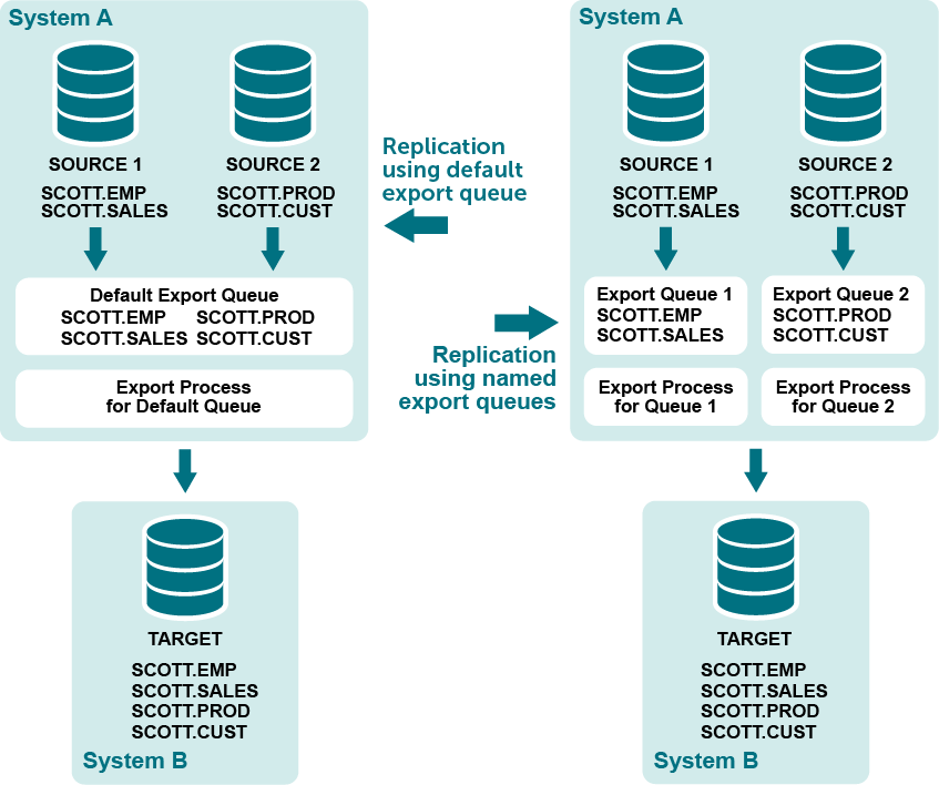 • Individual configurations: By default, SharePlex sends data from all active configurations through one export queue-process pair per target system, but the use of named Export queues enables you to separate each of those replication streams into its own export queue and Export process. In this way, you ensure that purge config or abort config commands that are issued for one configuration do not affect any of the others.