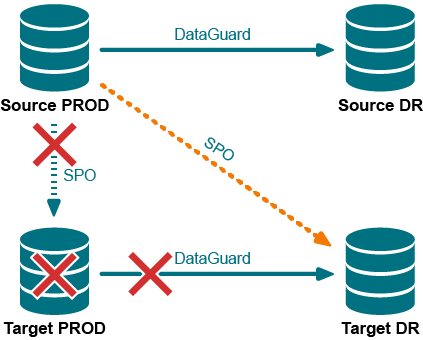 Because Target PROD is offline, Oracle Data Guard can no longer keep Target DR up to date. However, SharePlex can. SharePlex (SPO in the diagram) is able to resume replication from Source PROD to Target DR, thus resuming data availability.