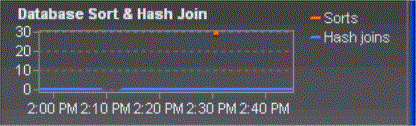 The Database Sort & Hash Join graph contains three series that summarize total sort activity performed for the application over consecutive monitoring intervals: