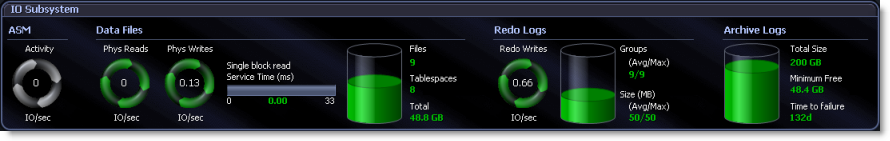 If installed, Oracle's Automatic Storage Management (ASM) system automatically stores and reorganizes data according to statistics collected from usage and user access patterns. The IO Subsystem panel displays this ASM metric:
