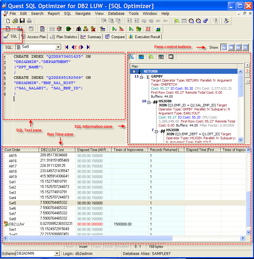 Use the SQL Information pane to toggle between the access plan or the DB2 optimized text for the original SQL or an alternative. You can also view information about the original SQL.