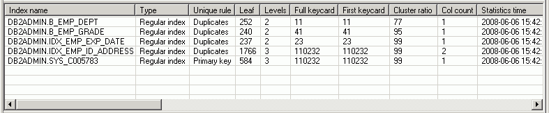For each index listed in the Index Statistics pane, the following information is obtained from the SYSCAT.INDEXES catalog view: