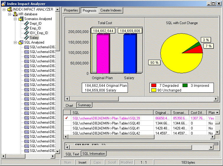 The Index Impact Analyzer window displays the information about the SQL statements that are saved in the Index Impact Analyzer. The display in the right section of the window depends on what is selected in the left pane.