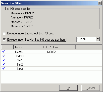 The Index Sets are ranked by Est. I/O Cost by default, with the exception for the Used Index which is placed at the top. You can sort either the Est. I/O column or the Index Set column by clicking the column heading.