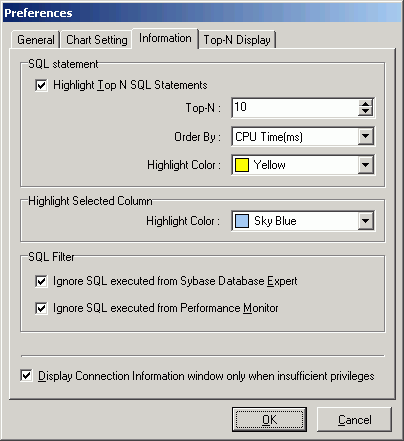 The Information tab on the Preferences window for the Performance Monitor determines which of the top SQL statements are highlighted, sets highlighting colors, and sets the automatic display of the connection information when logging on.