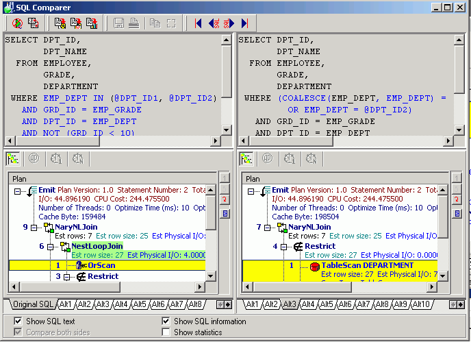 Displays the run time information for the original SQL statement and the selected alternative. The statistics are displayed for both the First Record and All Records if you have retrieved both times.