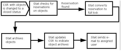 The third phase is the conversion of reservations into locks. Stat releases an object lock when the status of the CSR changes to a closed-type status, or when the developer manually unlocks the object or the object is reassigned to another developer. After unlocking an object, the Stat Central Agent then determines if there are any pending reservations on the object. If reservations on the object have been given to more than one user, these reservations are handled in chronological order, based on the time each lock was requested. The Stat Central Agent converts the first reservation in line into a lock and performs any applicable object archiving.