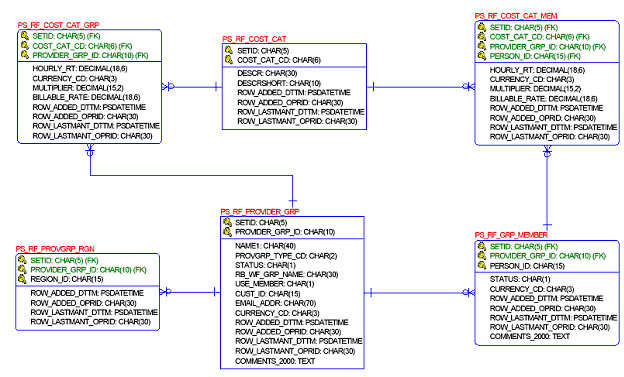 The following example is taken from PeopleSoft and is meant to illustrate the process of defining data object types in Stat. In this example, the goal is to configure Stat to support Provider Group data objects, which can then be archived and migrated from the CRM Field Service module to a PeopleSoft CRM environment. We will use the PeopleSoft-delivered Data Model to define our Provider Group data object type. The Provider Group tables and identifiers are detailed in the diagram below.