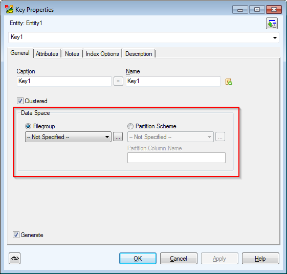Take notice of the Data Space area. If you click Filegroup, list of file groups will become available. If you select Partition Scheme, the options will change.