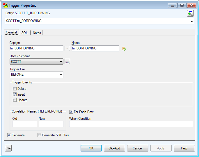 Example: Trigger Properties dialog | SQL tab (Oracle 10g db)