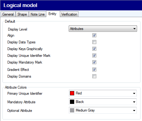Display Level - Select items you need to display in your logical model -  Entities, Primary Identifiers, Unique Identifiers, Attributes, Descriptions.