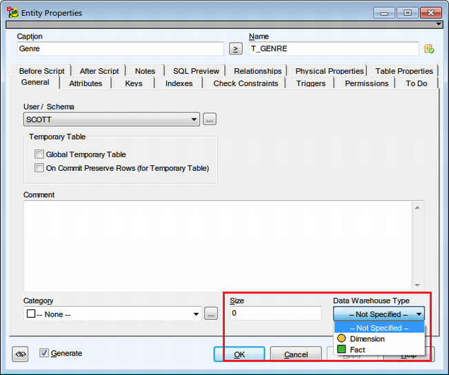 Select Settings Menu | Options | Physical Model | Entity tab | Form Settings | check Display Data Warehouse Type and Size.