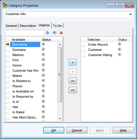 • In Entity/View/Relationship Properties, choose the desired category in the Category section on General tab.