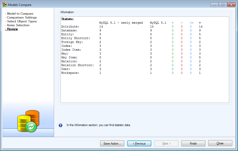 • Check the Review screen which shows you the final statistics and close Model Compare by clicking the Finish button.