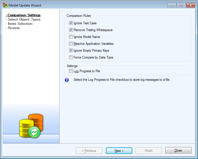 • Before Toad Data Modeler compares your model with the database, you need to go through some settings related to comparison.