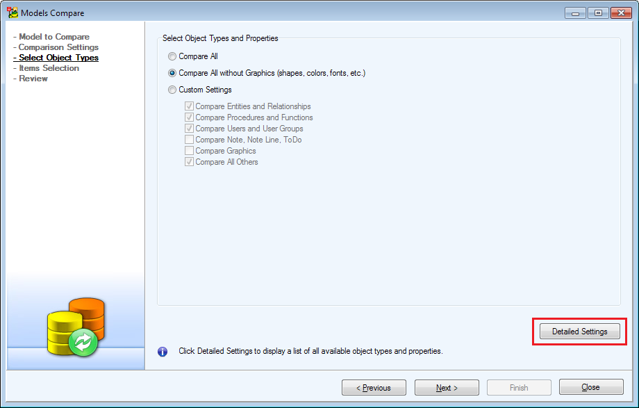 • Now you have to choose what types of objects will be included in the comparison. If you wish to select objects in more detail, click on Detailed Settings.