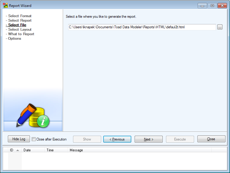 • There are two options available during the entire process of generating a report. Hide Log hides the bottom part of the dialogs which otherwise displays information related to the generation. Checking Close after Execution closes the dialog window after you're done creating your report.