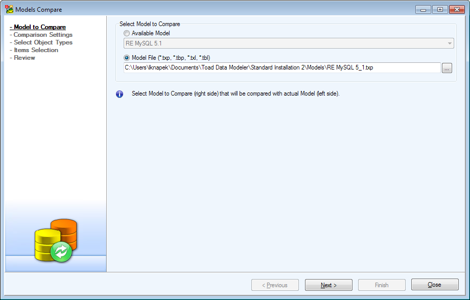 Note: The selected model has to be of the same database platform and version. You cannot compare DB2 10.5 and MySQL 5.1 models, or MySQL 5.1 and MySQL 5.5 models.