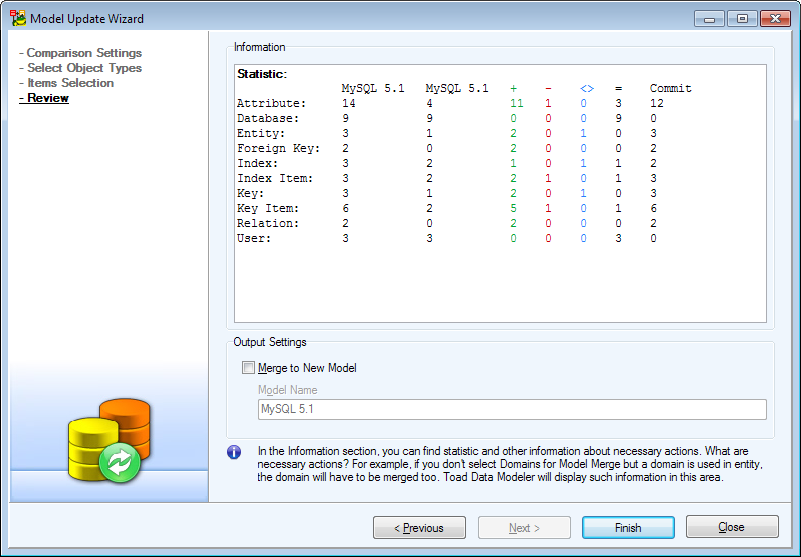 • The last dialog shows you the review of the Model Comparison. An option to Merge Model is available in case you don't want to only update your model. This option creates a new model which will appear in your Application View after finishing the update. Click on Finish and after a short while your Model will be updated.