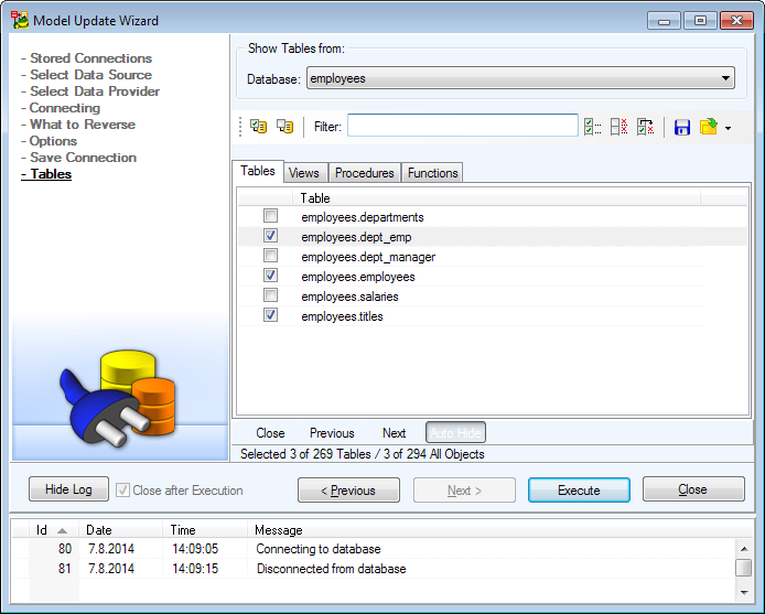 • You are now able to see the Compare Tree. It displays all differences between your current model and the database. The Model Update changes the model on the right (your model) so it matches the model on the left (the database). Check the changes you would like to execute and proceed to the next dialog.