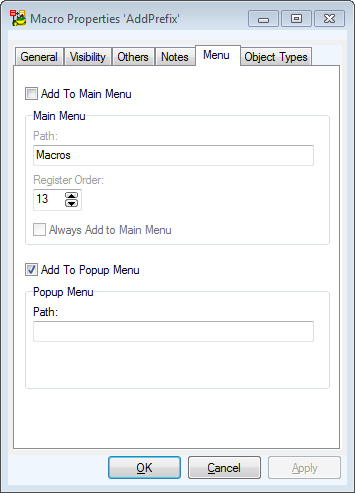 1. On tab Object Types, select in which object pop-up menu you want to display it. Select Workspace.