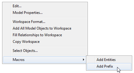 Solution: You will create a macro Add Prefix. The macro will be available via right-click menu on the Workspace. You want to create a user form where you will define the prefix and decide if you want to apply the change in Caption of attributes too.