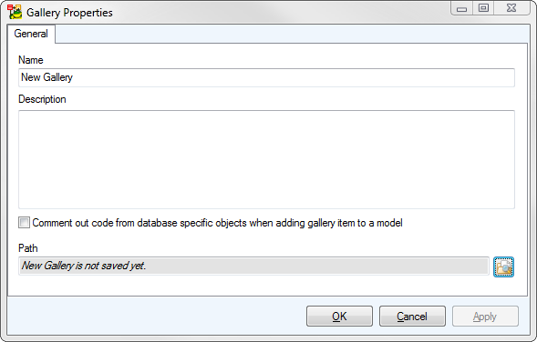 2. Choose the Gallery Name, enter its Description and choose whether you want to comment out code of database specific objects (this option is explained in the Inserting objects... section).