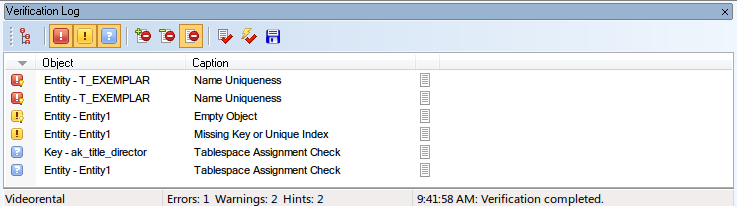 4. The result of the Model Verification is shown in Verification Log, which is displayed automatically. To display the log manually, select Windows Menu | Verification Log. Objects that did not pass the verification are also marked by error/warning icons in Model Explorer.