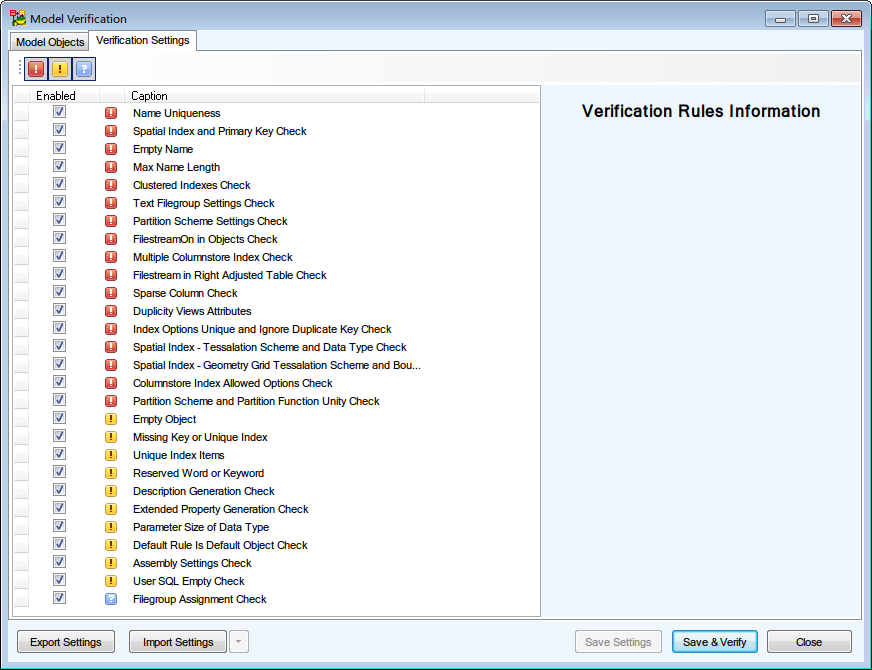 Verification Settings tab - Here you can enable/disable rules that should be considered during verification. Use the buttons on the top of the form to check/uncheck all errors/warnings/hints at once.