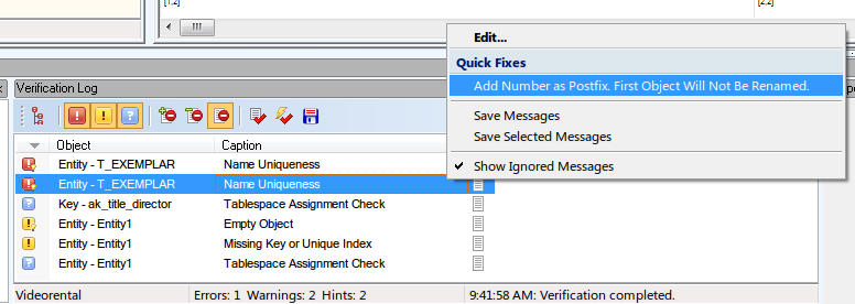 Toad Data Modeleroffers Quick Fixes - recommended solutions for problems and issues found by Model Verification. Quick Fixes are accessible for problematic objects both in Verification Log and Physical Model Explorer, in right-click menu.