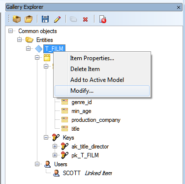 Modify (Item) Allows you to modify the stored item in a separate model and synchronize the changes with the item in the Gallery. See Modifying Items for more information.